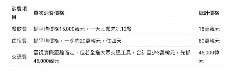 合計約 102 萬 5 千韓元,以本文發出當天(9/13)的匯率,韓幣一元等於 0.024 台幣,合計為新台幣 25,000 元。如果有要買東西、住比較好的飯店、泡咖啡廳,預算需要抓得更高,建議拉到台幣 35,000元 會比較保險。那要帶多少現金過去?現在韓國接近無現金社會,需要使用現金的場合較少,建議帶約 6,000元~10,000 元台幣到韓國去換即可。