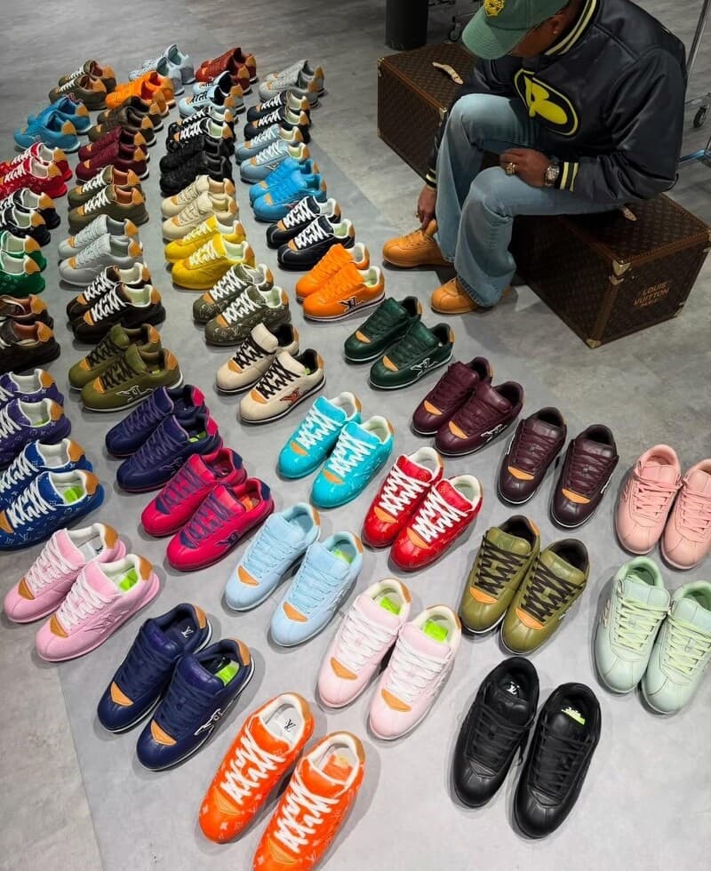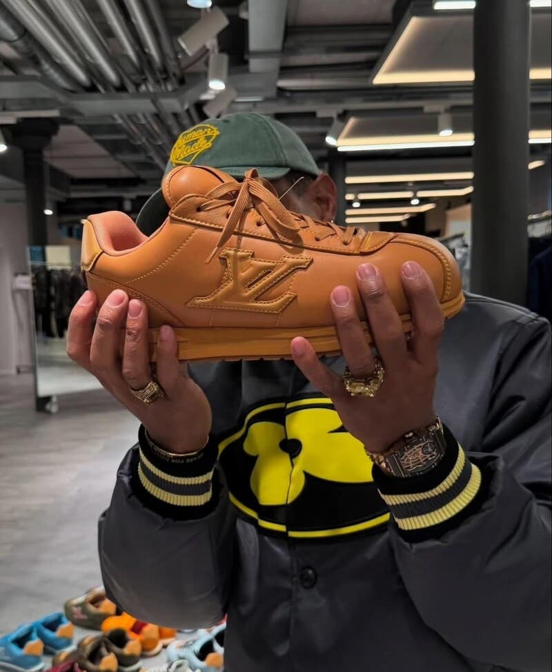 從圖片中可以看到,此雙 LV ButterSoft 有著厚實的鞋身輪廓,包括鞋頭以及鞋舌處渾圓飽滿,線條如奶油般圓潤絲滑,呼應其名稱「ButterSoft」,更不禁會令人聯想到 Nike 經典鞋型「阿甘鞋」Cortez 的設計外觀,頗有 90 年代的復古氛圍;而鞋側的 LV 標誌也十分顯眼,除了 Pharrell Williams 手上的這雙焦糖色的配色款式之外,他還一口氣曝光超過 40 種不同配色,搭配性十足。