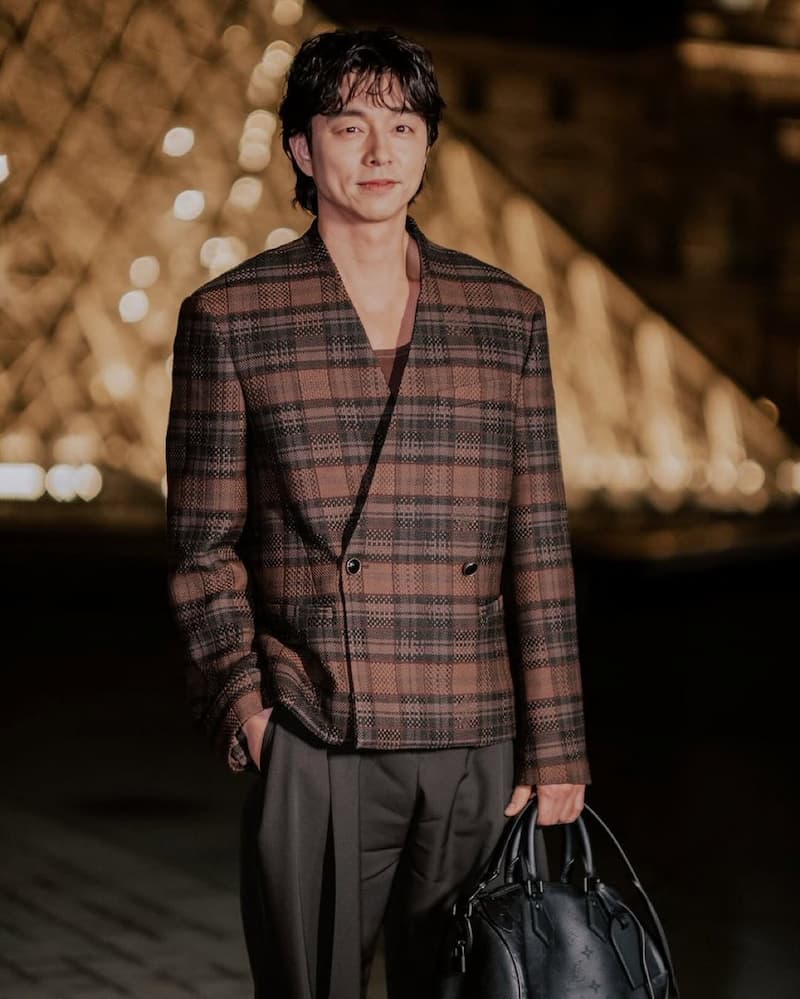 孔劉即使已經 45 歲,依然保持著良好的狀態,微捲髮造型搭配復古質感的棕色外套,展現出成熟又迷人的魅力。搭配上 LV Monogram 包,這款奢華配件更是為整體造型增添了幾分現代感,讓人印象深刻!