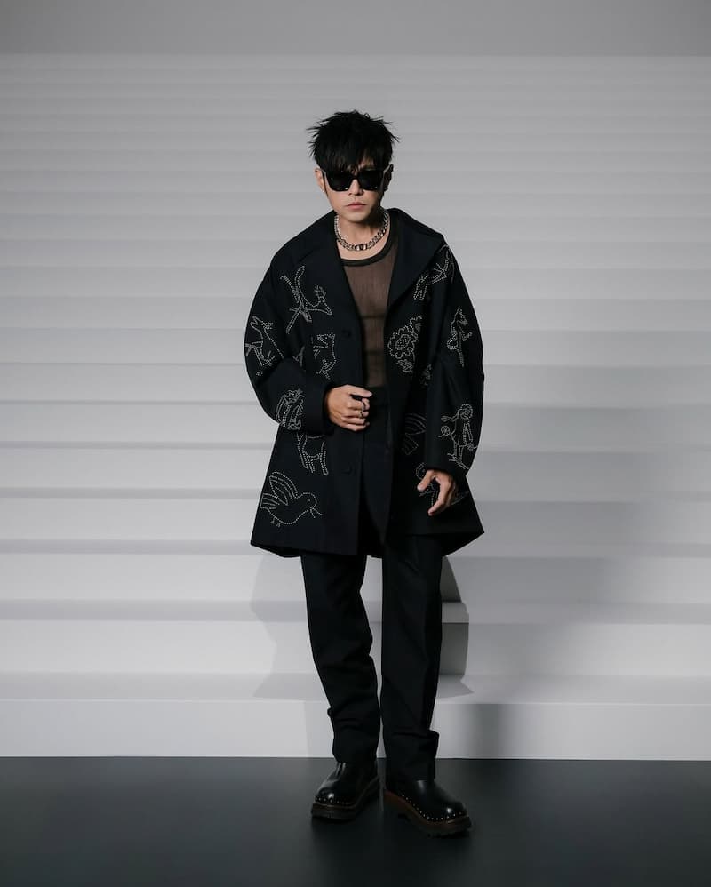 在 Dior 2025 秋冬男裝系列中,周杰倫身穿黑色羅紋背心搭配羊毛混紡大衣與長褲,打造出經典又低調的奢華感。大衣上以鉚釘勾勒出 Dior 與南非藝術家 Hylton Nel 合作的鳥類與狗狗圖案,注入趣味童心。周杰倫更以 Dior Oblique 半透明鏡框太陽眼鏡、CD Icon 項鍊與戒指點綴,讓優雅中透出不羈風格。