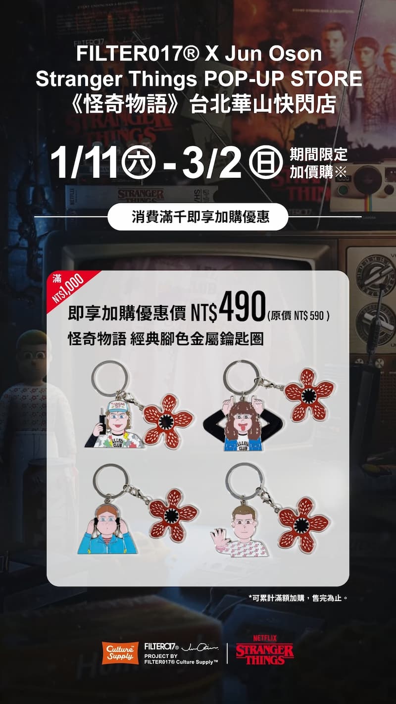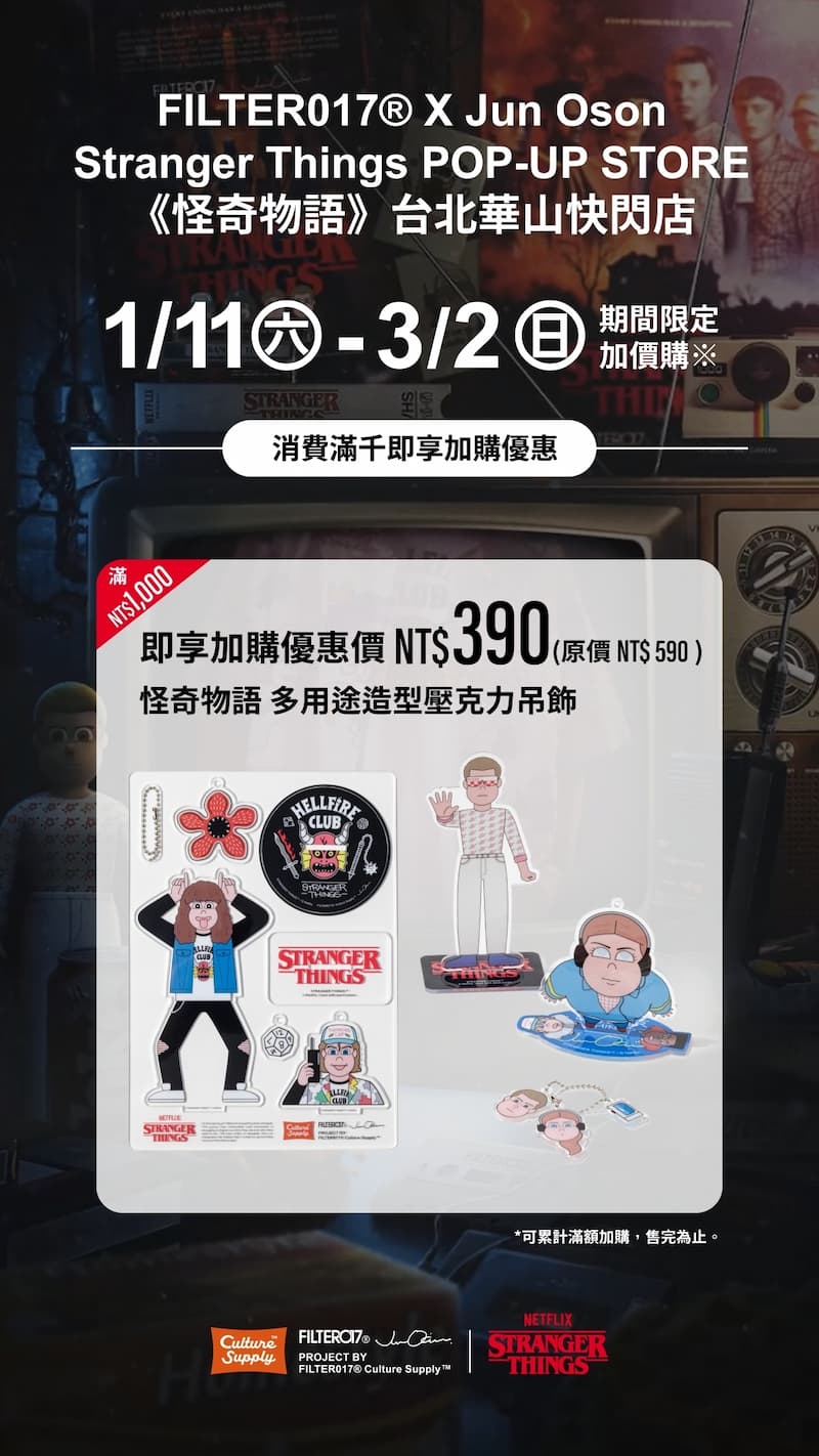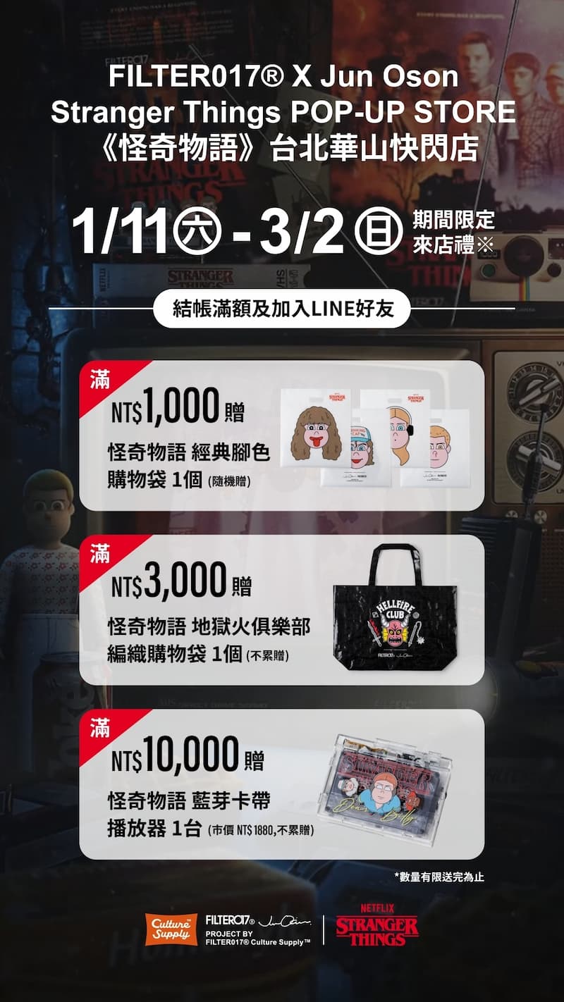 快閃期間,現場還提供多重限量好禮!消費滿 1000 元,即可加價購「怪奇物語多用途造型壓克力吊飾」或「經典角色金屬鑰匙圈」;滿 3000 元贈「地獄火俱樂部編織購物袋」;消費滿 1 萬元,更可將「卡帶播放器」帶回家,數量有限,送完為止!