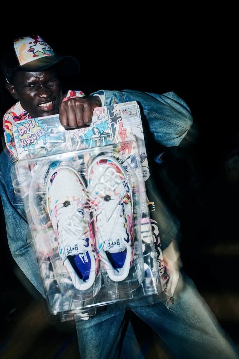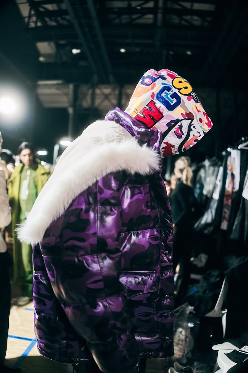 此次的聯名系列從細節到整體,處處體現了雙品牌深厚的設計語彙。彩虹迷彩鯊魚連帽衫、泡殼包裝的 Bape Stas、卡車司機帽,以及以 Lil Wayne 為靈感的紫色皮夾克,無不喚醒人們對 Bape 21 世紀黃金時期的回憶。然而,這些單品並非簡單的復刻,而是經過 Colm Dillane 精心改造,注入了他專屬的 KidSuper 風格。