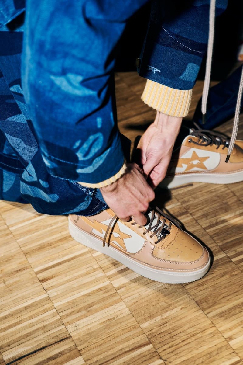 鯊魚連帽衫是這次系列中的亮點之一,以笑臉取代傳統皺眉牙齒設計,賦予經典單品全新視角;Bape Stas 則以日本 Boro 面料替代標誌性的漆皮鞋面,將東方工藝與街頭時尚完美結合;系列中貫穿始終的迷彩圖案,融合了兩個品牌的經典印花,呈現出高度協調又別具一格的設計語言。