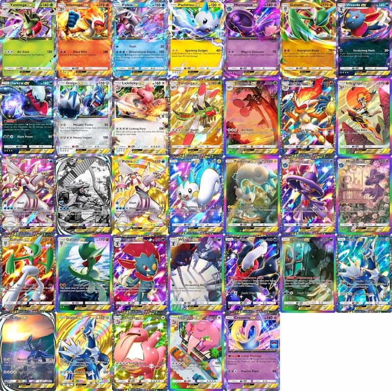 而寶可夢的部分,基本上就是以第四世代「神奧地區」的寶可夢為主,ex 系列除了確定有日前在官方釋出影片中出現的帝牙盧卡、帕路奇亞、帕奇利茲之外,預計還會有遠古巨蜓、烈焰猴、夢妖魔、艾路雷朵、瑪狃拉、達克萊伊以及大舌舔,不過御三家貌似只有先給火系的烈焰猴有 ex 版本,土台龜和帝王拿波並沒有 ex。稀有度最高「皇冠等級」的卡牌版本,則是做給本次擴充包兩大封面神獸帝牙盧卡與帕路奇亞。
