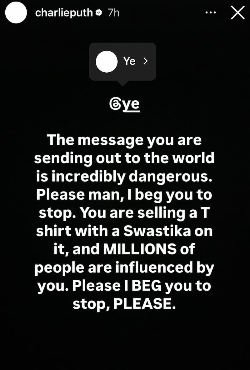 肯爺的荒唐舉動遭到許多人抨擊,知情人士透露,肯爺的友人與妻子比安卡曾極力勸阻他販售帶有納粹標誌的商品,但他始終不為所動,堅持將其視為「行為藝術」,連歌手 Charlie Puth 都看不下去,在個人 IG 發布限動並標注肯爺:「你向世界發出的訊息非常危險,拜託,我求你停下來,你正在銷售一間帶有納粹標誌的 T-shirt,數百萬人受到你的影響,請你停下來,拜託。」不曉得大家怎麼看?歡迎留言分享,亦可延伸閱讀:肯爺 Kanye West 進駐小紅書帳號!曬自拍照:「康康我的新頭像!」