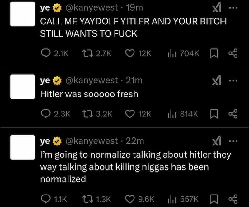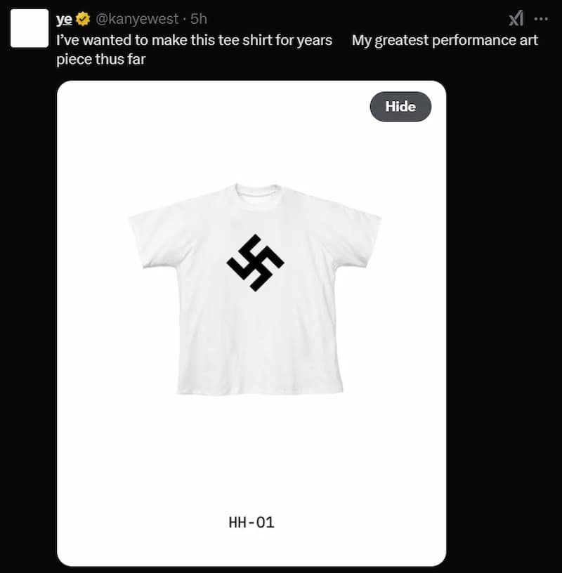 肯爺 Kanye West 2023 年才為「反猶太言論」向猶太人致歉:「我對我可能造成的任何痛苦深表遺憾。」沒想到近日在在超級盃(Super Bowl)期間投放廣告,引導觀眾前往商品網站,點進網站的使用者發現,商品竟然是一件印有「黑色納粹標誌」的白色 T-shirt。此外,肯爺近日在 X 頻繁發布反猶太仇恨言論,不僅自稱是納粹,還公開表達對希特勒的崇拜,連過去為「反猶太言論」的道歉都收回,他更說:「我想製作這件 T-shirt 已經很多年了,這是我迄今為止最偉大的行為藝術作品。」目前他的 X 帳號,被官方停用了。