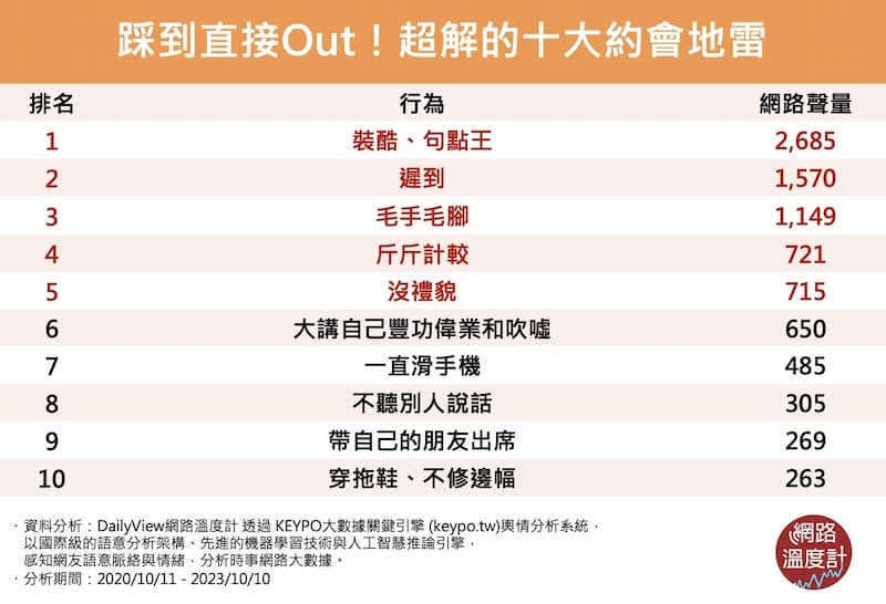 想談個戀愛,真的有那麼難嗎?掌握約會地雷,很可能就是你成功與否的關鍵!當雙方面對進一步發展的臨門一腳,一定會在約會過程中觀察對方,除了追求更了解彼此的習性,也可以透過許多小細節,知道對方的優缺點,來判斷到底適不適合成為另一半。這次《DailyView網路溫度計》透過《KEYPO大數據關鍵引擎》輿情分析系統,調查出約會的地雷,會讓人覺得「天啊!超扣分」,小心讓培養中的感情小苗瞬間枯萎呀!快一起來看看,約會時記得避開這些雷點,別傻傻踩到爆炸還不自覺!