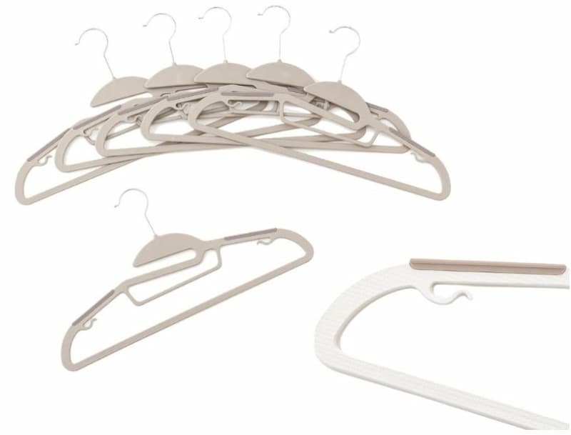 3 coins 的這個防滑衣架一組 6 個,衣架上面有一個凹槽,可以讓衣服更好掛到衣架上且不易變形,還有防滑條可以防止衣服滑落,掛勾也可以 360 度旋轉,用過的人都大讚,一次買十組沒問題!
