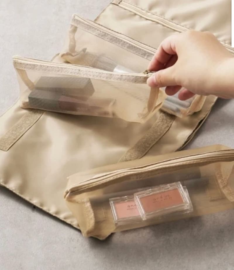 接下來是一款化妝包,這款化妝包的材質是防水材質,裡面有多個隔層收納袋用魔鬼氈固定,可以拿來放不同類型的化妝品,眼影、唇膏、刷具等等,需要哪一個種類的東西還可以單獨拆下來做使用,出國帶這個一包搞定所有東西!