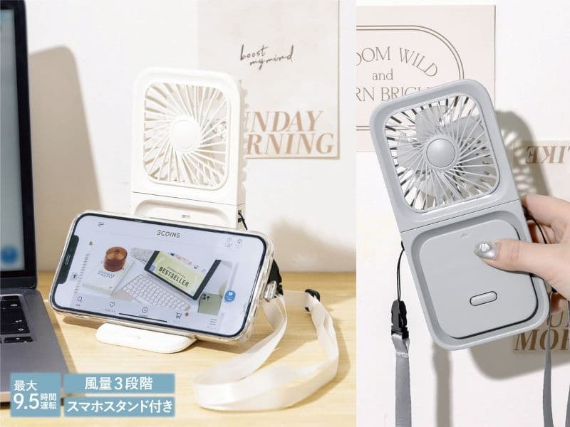 夏天必備的手持風扇你也要買!但是 3 coins 的手持風扇有四種用法,配有掛繩跟 USB Type-C 充電線,不僅可以手持,也可以放在桌面上做使用,除此之外還能作為手機支架,一邊吹風一邊架著手機,一物多用超級讚!