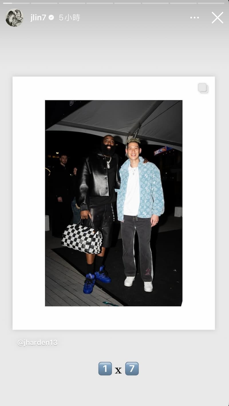 林書豪過去在2012 至 2014 年與 James Harden 共同在火箭隊效力,後續林書豪轉戰湖人隊後,兩人就再也沒有當過隊友過。隨著近期 NBA 明星賽週的到來,讓林書豪與 Harden 又有了再度重逢的機會,只見兩人見面後彼此給予擁抱致意並一同合照,後續 Harden 也在 IG 貼文發布自己與林書豪合照的照片,林書豪則也轉發於限動並配文寫道:「1x7」。