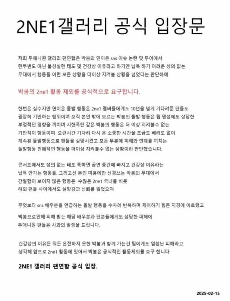 2NE1 的粉絲聯合會「2NE1 Gallery」透過官方聲明表示,朴春接連在社群媒體上引發爭議,並且在巡演中的不負責任態度,已經超過粉絲所能容忍的範圍,聲明中指出:「朴春以健康問題為由,卻展現出敷衍的舞台表現,這些行為讓我們再也無法坐視不管。我們正式要求將朴春排除於 2NE1 的活動之外。」聲明還提到,接連的突發行為不僅傷害了團隊形象,也對等待超過 10 年的粉絲造成了嚴重的背叛感。