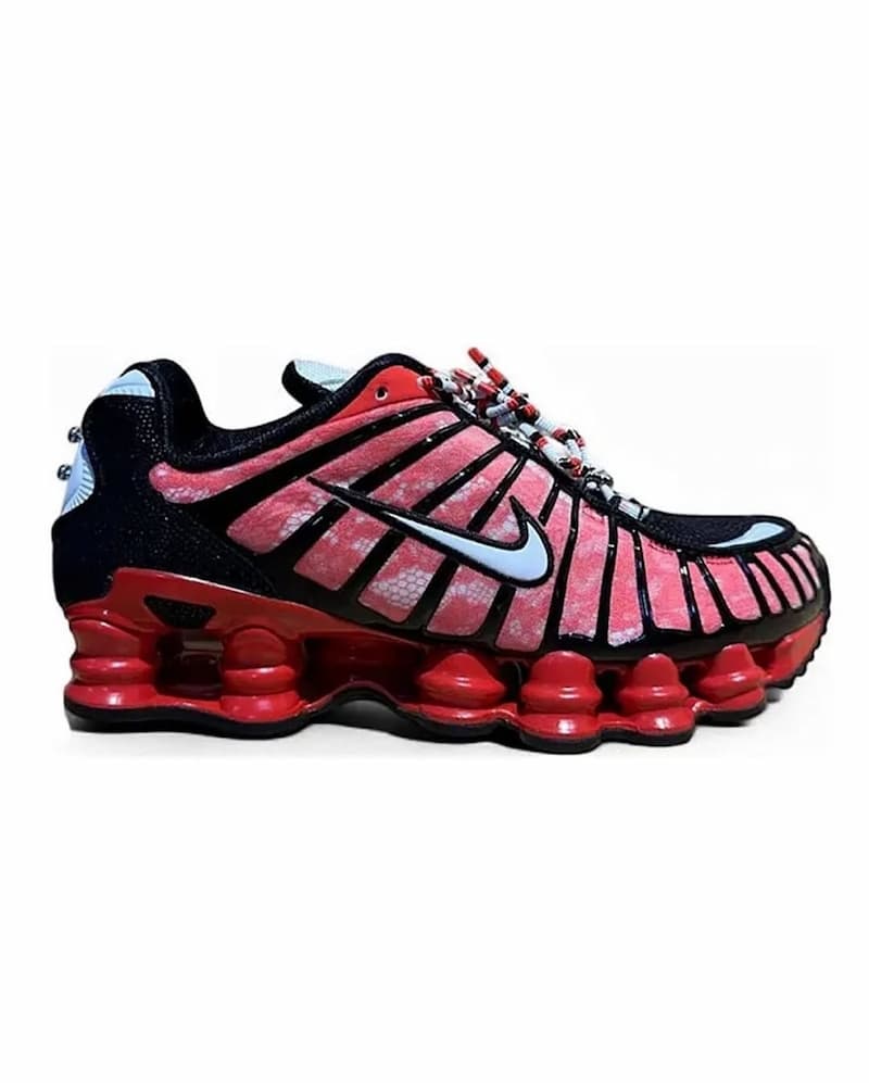 當然,這次最期待的還是 Tisci 對 Nike 經典 Shox TL 系列的設計,以 90 年代未來感鞋型為基底,推出「黑白」、「白黑」、「哈瓦那紅」三款配色。鞋身以蛇紋壓紋與鉚釘裝飾,尤其紅色款式更為吸睛,徹底顛覆 Shox 的科技運動印象。
