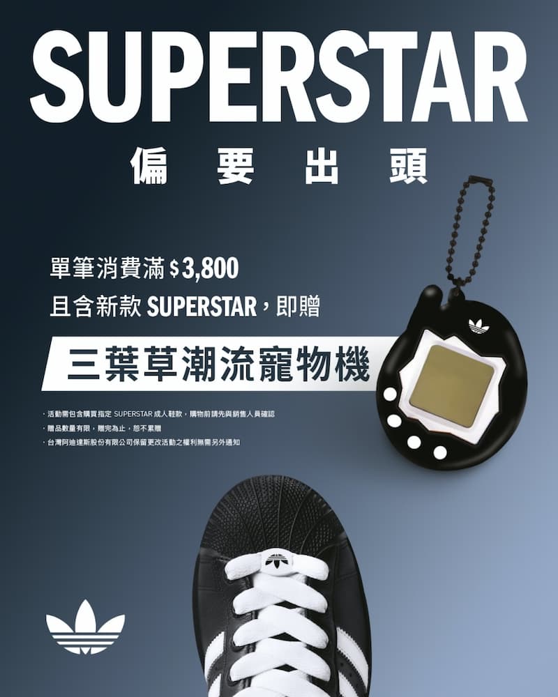 adidas Originals 於此期間推出消費者互動闖關活動,完成指定任務即可獲得遊戲積分,並有機會獲得三葉草潮流寵物機及限定潮流好禮。立即號召你的潮流夥伴,一同前往信義區,征服 SUPERSTAR 貝殼頭街區!
