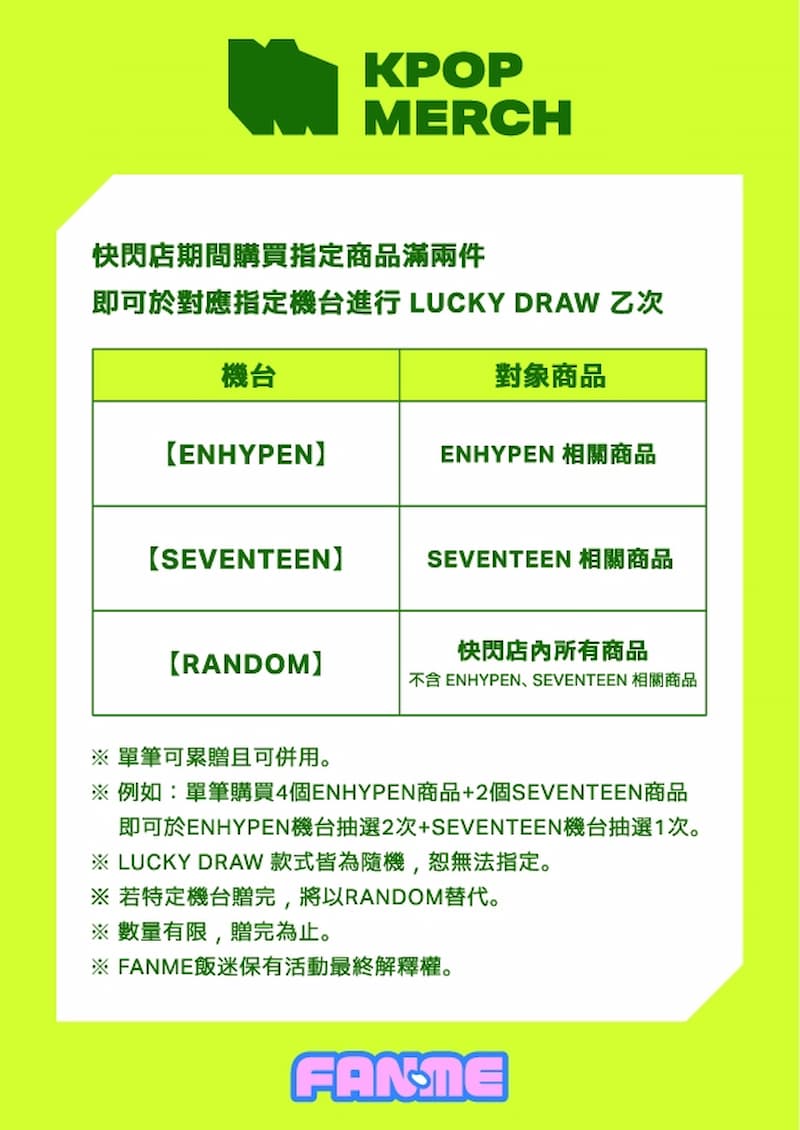 台灣官方授權娛樂周邊品牌「FANME 飯迷」以「FAN」為核心理念,致力於打造專屬粉絲的追星環境,提供 K-POP 專輯、應援小物、韓流周邊等豐富的官方授權產品,同時策劃多樣粉絲福利與獨家活動,成為粉絲應援旅程中的最佳夥伴。這次 FANME 飯迷除了攜手 KPOPMERCH 推出首發限定店,還將持續於官方社群平台發布簽名會、FAN CONCERT 等獨家追星資訊,首場重磅活動就是 2025 年 2 月 27 日舉辦的 (G)I-DLE MINNIE 首張專輯《HER》台北線下簽名會,未來也將帶來更多偶像近距離互動的驚喜企劃,讓台灣粉絲享有更多福利!