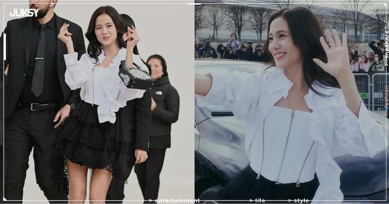 Jisoo 受邀出席 Dior 2025 秋冬系列發表會,當天以品牌全新設計登場,身穿白色棉質馬甲襯衫,搭配黑色羊毛絲質蓬紗蕾絲短裙,腳踩綁帶長靴,手提刺繡圖騰的 Lady Dior 手袋,黑白配色展現甜美與帥氣兼具的個性魅力。當她壓軸抵達現場時,一下車便親切與媒體及品牌代表打招呼,隨後也熱情向等候已久的粉絲揮手示意,更驚喜的是,Jisoo 當場加碼跳了〈earthquake〉的「手指舞」,還開心拿出手機與歌迷自拍,讓現場歡呼聲此起彼落。