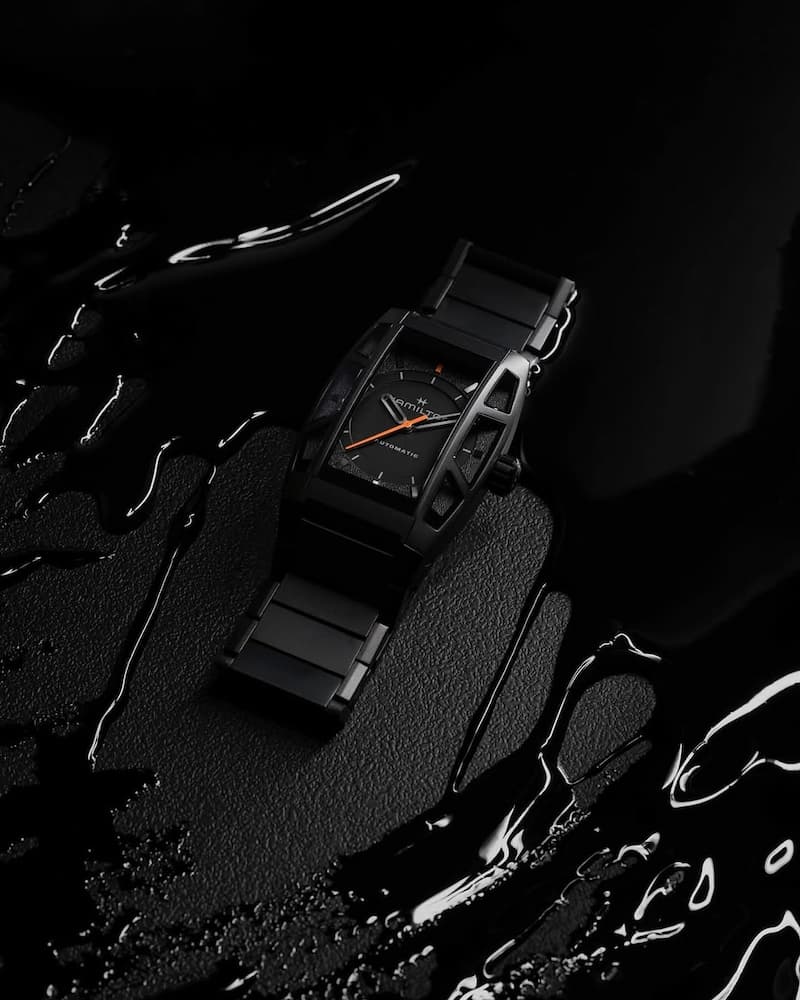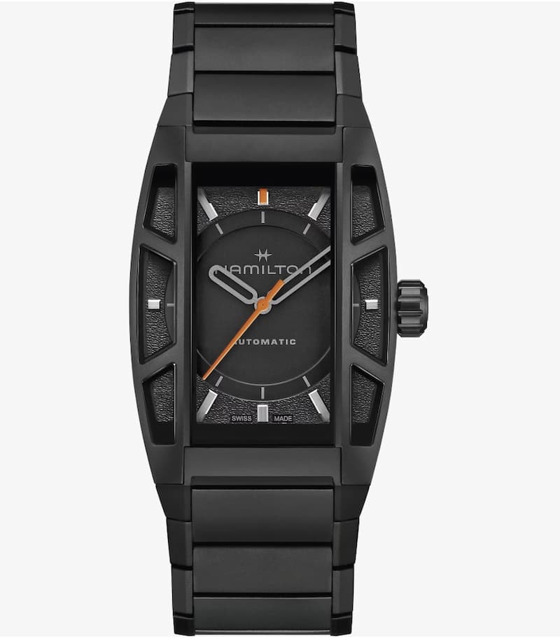 錶盤以霧面黑色為基底,搭配灰色時標與指針,整體風格低調沉穩。然而,Hamilton 巧妙地運用亮橙色點綴秒針與 12 點鐘標記,為這款腕錶增添了一抹活力,同時也呼應了遊戲中「連結」的主題。錶帶則採用寬版鏈節設計,同樣以黑色鈦金屬 PVD 塗層處理,與錶殼完美呼應,整體風格既前衛又充滿機能感。