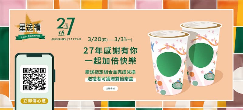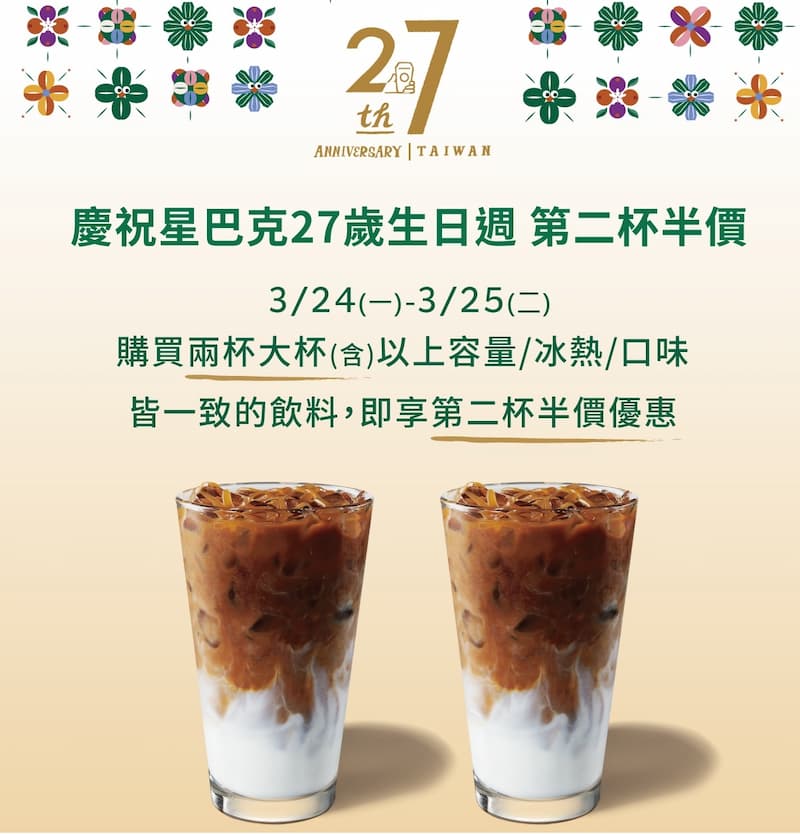 星巴克即將迎來 27 歲生日,為了慶祝這個特別的時刻,全台星巴克門市將於 3 月 24 日至 3 月 25 日推出限時優惠活動,包括購買兩杯大杯(含)以上容量的飲料即可享有第二杯半價的優惠。這項活動不受限於飲品的冰熱、口味選擇,更吸引眾多咖啡愛好者前來共襄盛舉。具體優惠詳情和限制建議參考星巴克官網。