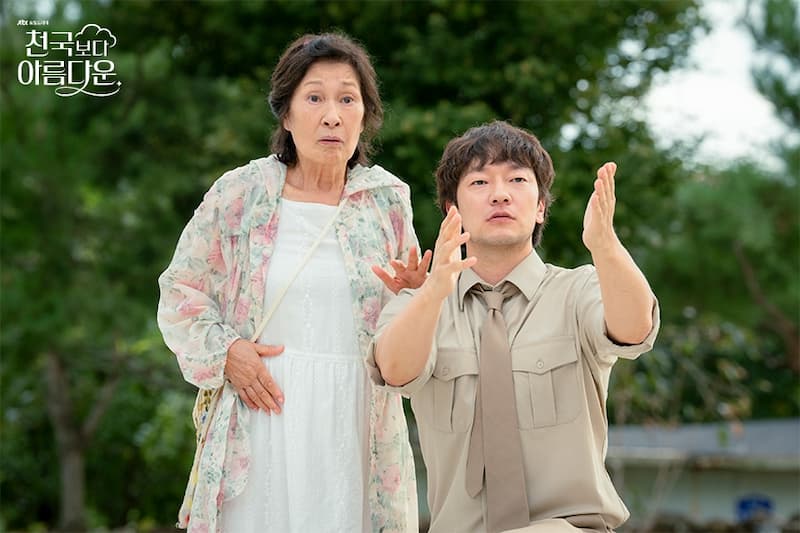 劇中,83 歲的金惠子飾演的李海淑在天堂中重遇已故的丈夫高樂俊,由孫錫久飾演,但對方卻以 30 歲的形象出現,兩人展開了一段既溫馨又幽默的戀情。這部作品被評價為最溫暖的奇幻愛情劇,金惠子表示這可能是她最後一部作品,頗具珍貴性。此外,韓志旼飾演失憶的神秘女子小絮,李姃垠飾演海淑的好友李英愛,還有千虎珍飾演的天堂支援中心主任和柳德煥飾演的熱血牧師,這些角色共同構築了一個既奇幻又引人深思的故事情境。隨著劇情進展,觀眾將揭示更多角色的深度故事,引起期待和好奇心。