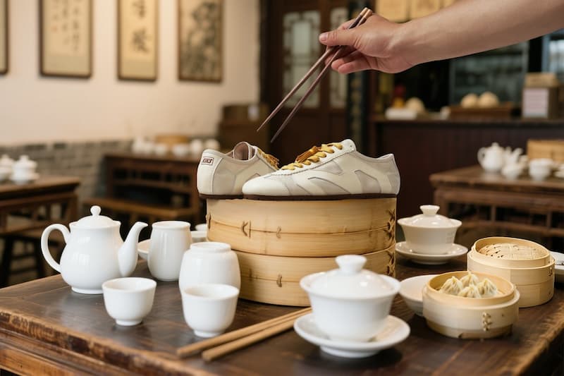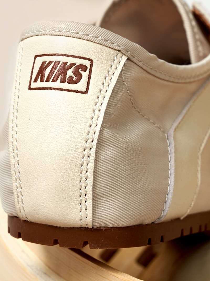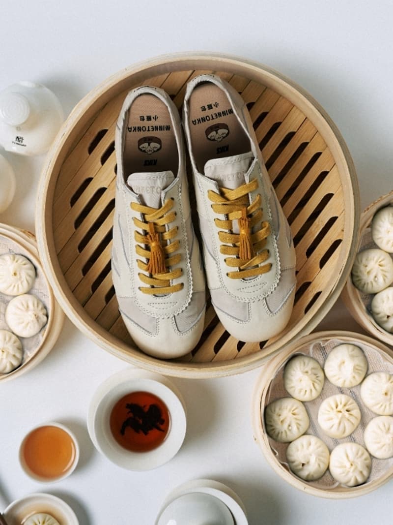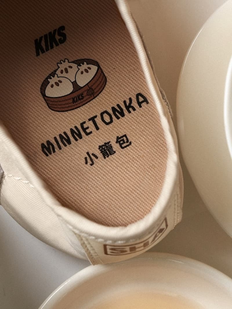 在全新的 KIKS x MINNETONKA MS70「上海小籠包」配色方案中,象徵大眾美食小籠包表面鬆軟面皮的白色,成為該鞋款主要的色彩基調。對此,MINNETONKA MS70 透過羊皮面料和尼龍布材質,讓鞋身質感層面營造出更模擬小籠包麵皮的細膩感,而與之搭配的深色外底,更是來自小籠包沾醋汁後的外觀特點。