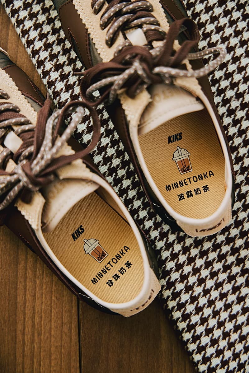 另一款 KIKS x MINNETONKA MS70「台北珍珠奶茶」配色,是以奶茶色與黑珍珠色為基調,在塑造大面積深色鞋身的同時,亦於鞋頭、鞋帶孔、鞋舌、鞋領等醒目區域搭配淺色視覺的奶茶色,明撞對比中產生的反差珍珠色效果,而鞋身 LOGO 與鞋底呼應黑珍珠色澤,鞋面選用奶茶色牛剖層皮革與尼龍布,更適配夏季穿著。此外,和「上海小籠包」配色的配置一致,在「台北珍珠奶茶」配色的鞋墊位置,同樣設有波霸奶茶的字樣和卡通圖案細節,這也成功添加了鞋款設計上的趣味感元素。