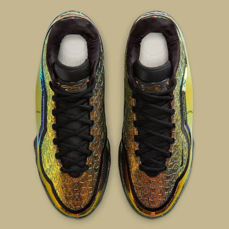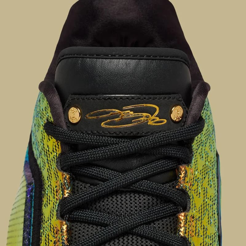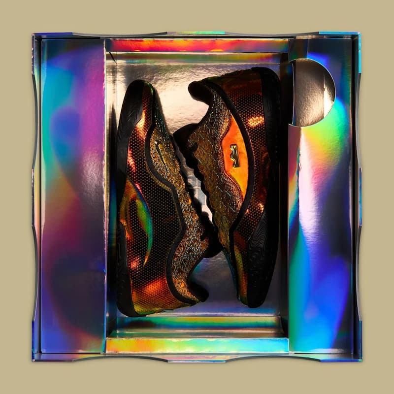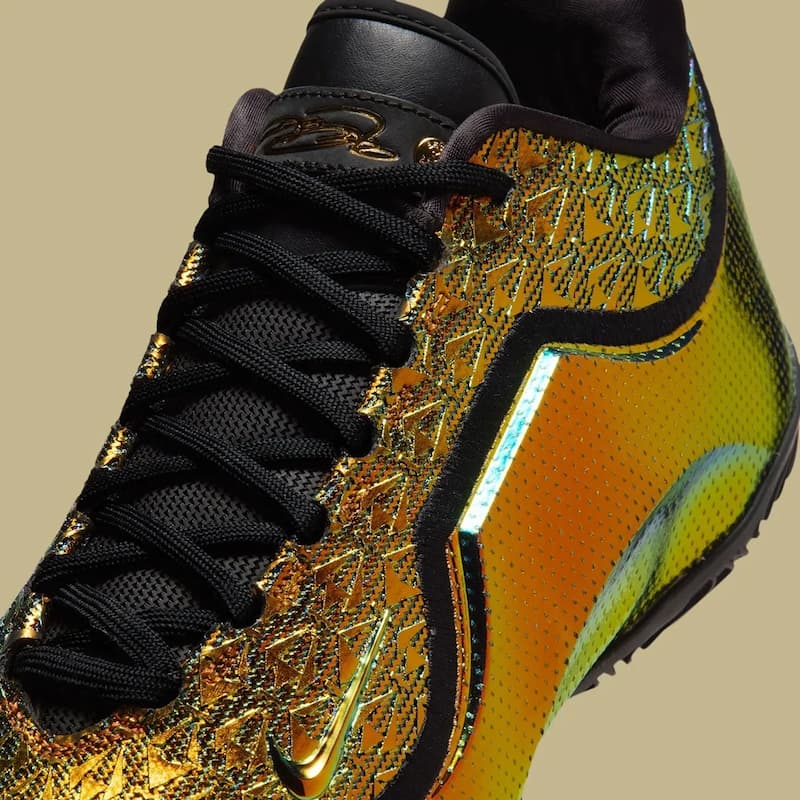 從先前曝光的測試版本可以看到,Nike LeBron 23 採用低筒配置,中底部分在外側延伸出巧妙地勾勒出其個人「皇冠」Logo 的造型輪廓,識別度相當高。此番官方搶先釋出了 Nike LeBron 23 "40K Gold" 配色圖輯,全鞋以充滿奢華感的黃金色調注入,並帶點虹彩的反光效果,透過黑色點綴作為對比,鞋面上側刻著滿滿特殊壓痕紋路,鞋舌的草寫簽名、以及側面小小的 Swoosh 及皇冠標誌彰顯身份,後跟處更放上了顯眼的「40K」古典貨幣字樣,象徵其在 NBA 累積超過 40000 萬分的輝煌壯舉,甚至就連鞋盒的外觀也設計地相當豪氣,說是 Nike LeBron 球鞋系列最為奢華的版本也不為過。