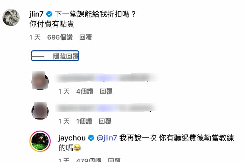 周杰倫日前在 Instagram 分享了與林書豪打網球的趣味片段,影片中兩人互動輕鬆逗趣。林書豪在留言區幽默表示:「下一堂課能給我折扣嗎?你付費有點貴。」沒想到周杰倫立刻回覆:「我再說一次,你有聽過費德勒當教練的嗎?」逗得大批網友笑聲連連。不僅如此,粉絲們也紛紛加入「亂問行列」,與周董的互動趣味十足。有網友挑戰:「敢不敢比一下籃球?」周杰倫乾脆回答:「不敢。」另一名粉絲好奇詢問:「哥,你 50嵐都喝什麼啊?」周董也親切回覆:「珍奶,或是其他甜的。」這一連串幽默又親民的互動,讓網友紛紛留言直呼:「周董太可愛啦!」