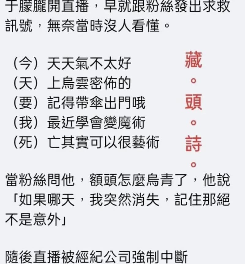 中國男星于朦朧墜樓身亡的消息震驚娛樂圈,至今已過 10 天,死因仍未明朗,引發各種陰謀論與揣測。近期更有粉絲在社群平台翻出他生前直播畫面,驚覺疑似以藏頭詩方式向外界發出「求救訊號」,令人毛骨悚然。