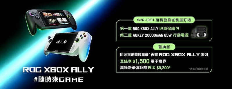 ROG玩家共和國與Xbox跨界合作最新電競掌機——ROG Xbox Ally與ROG Xbox Ally X,發表後震撼掌機市場,引爆玩家熱議與期待,詢問度居高不下。ROG Xbox Ally系列不僅結合Xbox與Windows PC遊戲的優勢和彈性,更擁有同級最佳的人體工學設計握感與全螢幕Xbox UI介面,徹底解放電競掌機潛力,重塑市場新標竿。ROG玩家共和國今(26日)宣布開放預購,10月底前購機,登錄送20000mAh 65W行動電源與ROG Xbox Ally收納保護包(總價值NT$3,389)。活動期間,指定電競掌機舊換新,回收價最高NT$9,200;完成回收並購買ROG Xbox Ally系列,登錄再送NT$1,500電子禮券。