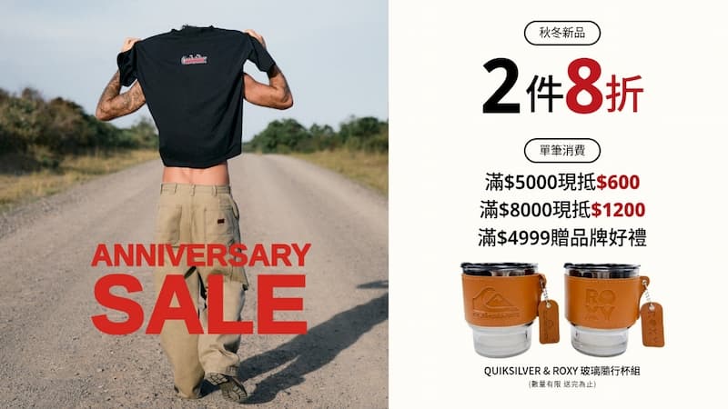 配合各大百貨檔期QUIKSILVER同步推出週年慶專屬優惠與新品折扣,凡選購秋冬新品享有2件8折;單筆消費滿$5,000現折$600、滿$8,000現折$1,200,更有滿$4,999即可獲得限量的品牌玻璃隨行杯兩入組。