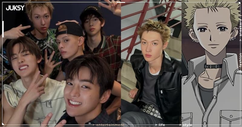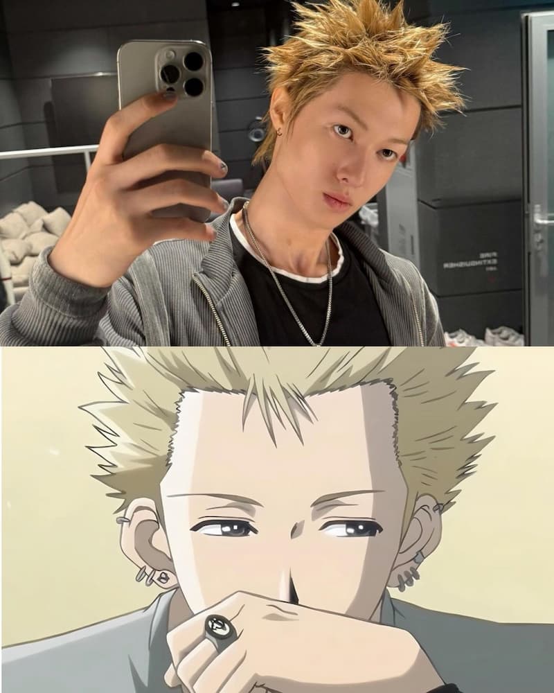 團隊中的人氣人物朴宇宙(Martin),他的「刺蝟頭」直接勾起許多人對日本的印象,有不少網友表示這個髮型很像《NANA》漫畫中「寺島伸夫」的髮型。這種造型強調立體層次與空間感,關鍵在於打薄的功力。頭髮經過細緻修剪後,再利用定型品將髮束一根根立起來,營造叛逆卻帥氣的效果。金色的染髮更突顯了他的白皙膚色。這款髮型推薦給喜歡日系穿搭、或想要展現個性張力的人。