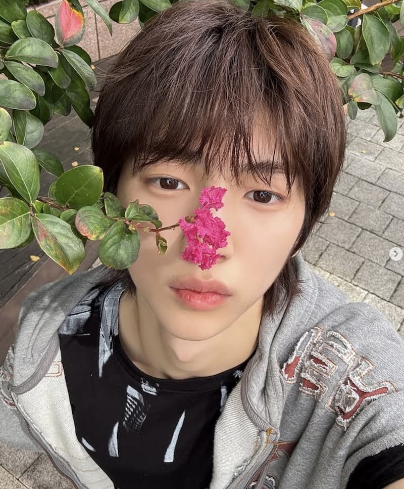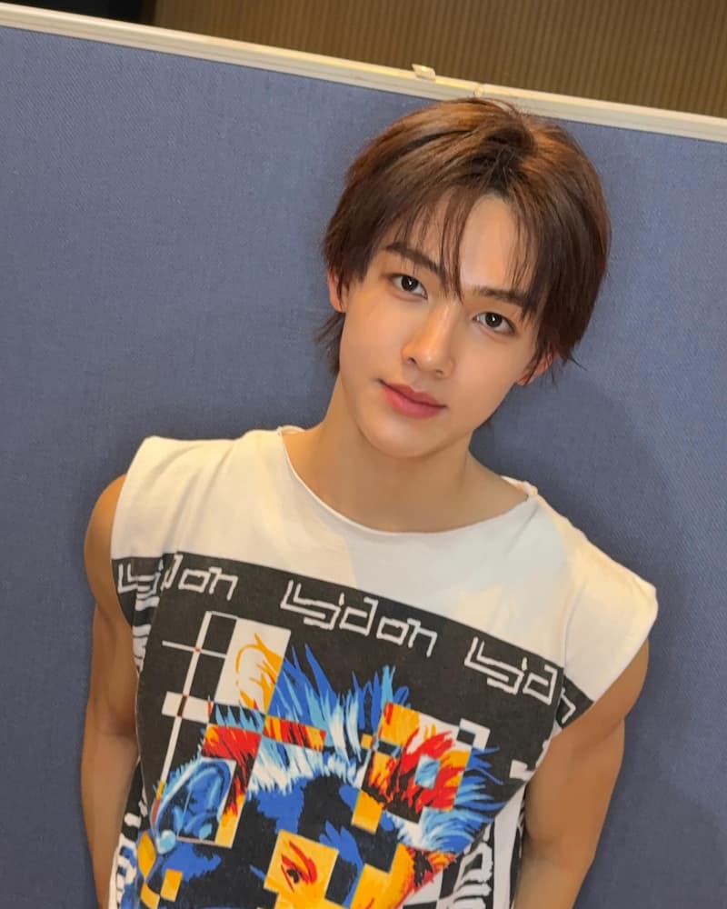 團隊裡年紀最小之一的嚴成玹(SEONGHYEON),頭上頂著的是韓系自然分層中長髮,長度落在耳下到頸部上緣之間,透過低層次修剪保留了厚度,使頭型看起來更飽滿自然。額前的瀏海不是整齊的中分,而是略微偏中分,幾縷細碎髮絲自然垂落,柔化了臉部輪廓,也帶出一種親和力。兩側髮尾微微外翹,增添了隨興的氛圍,整體感覺乾淨卻不單調,帶有「鄰家男孩」的清爽氣質。