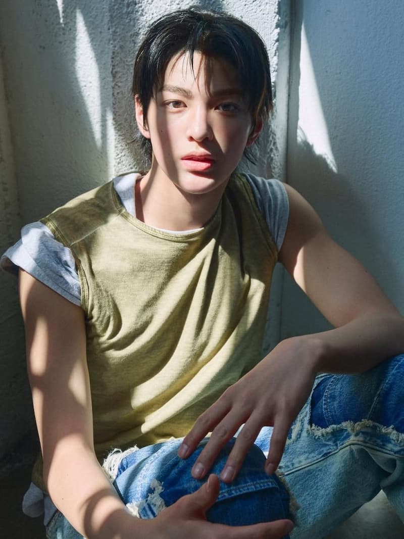 安乾鎬(KEONHO)的髮型看似隨性,其實是透過層次感與濕潤質感打理出來的微中長髮。前額髮絲自然垂落,帶點凌亂感卻不會失控,非常適合喜歡保有隨興魅力的人。這類髮型在日常中可以用免沖洗的造型霜或髮蠟增加線條,搭配偏暗色染髮,低調又有型。