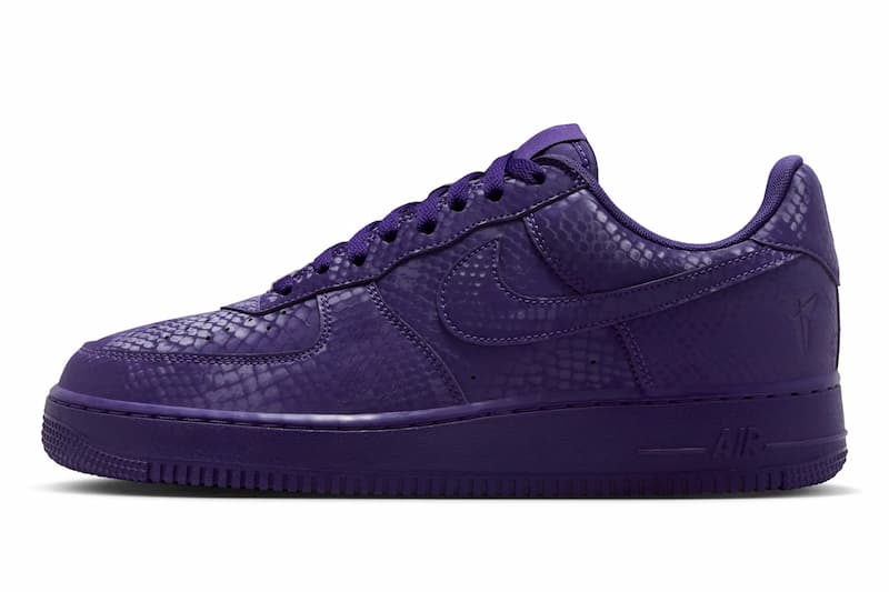 這雙 Kobe Bryant x Nike Air Force 1 Low 鞋面注入標誌性的紫色,輔以蛇鱗紋路圖案點綴,並於後側方放上 Kobe「黑曼巴」專屬 Logo 彰顯身份,鞋帶上的扣環則印有「FOREVER」字樣;最大亮點莫過於後跟處的刺繡工藝,左、右腳分別以「8」及「24」呈現,向 Kobe 球員生涯最標誌性的兩個球衣背號致敬。