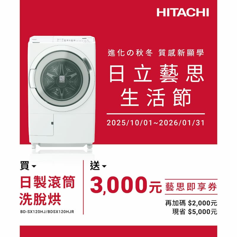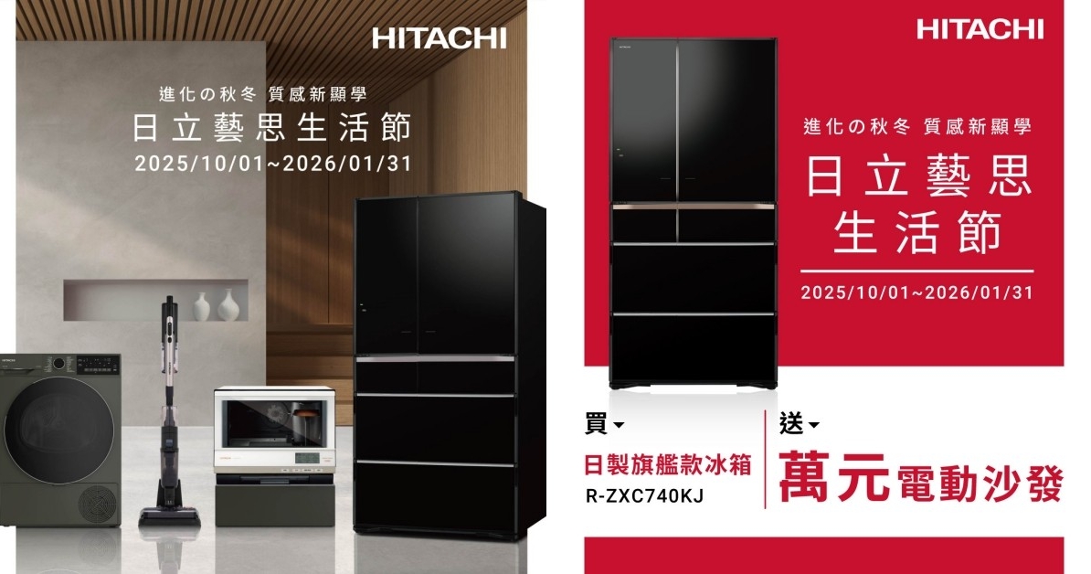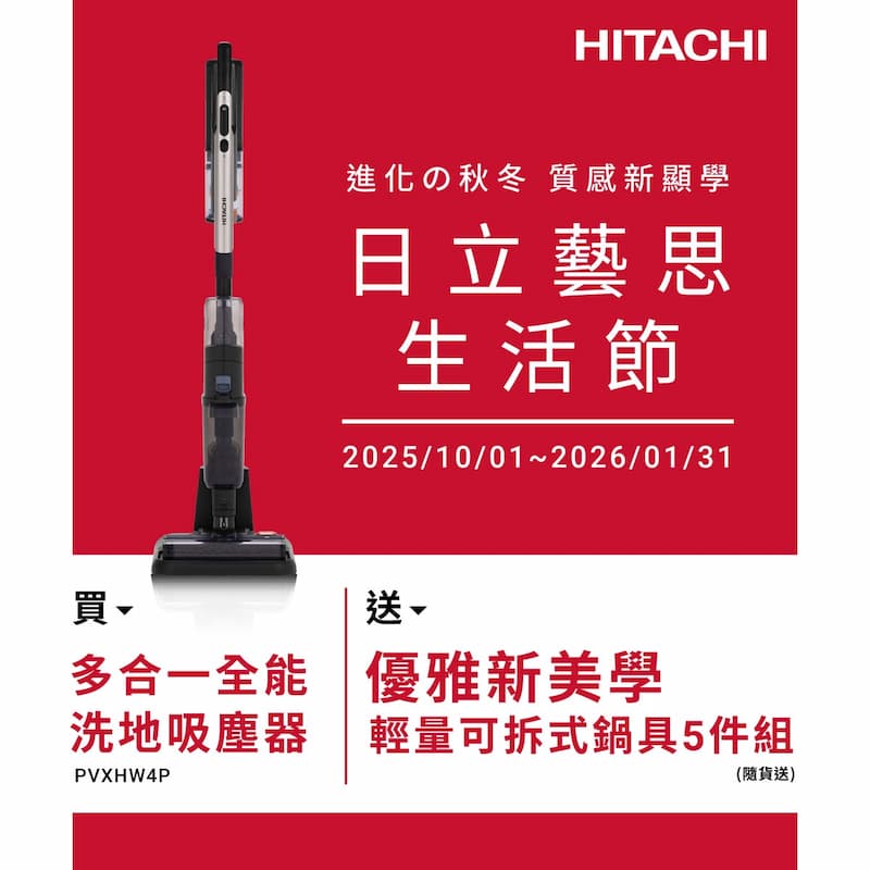 秋冬家電最強檔,比周年慶更優惠的「日立藝思生活節」年末優惠再推出!即日起至2026年1月31日,購買指定日立家電最高可省7,000元(含政府貨物稅減免),還有萬元電動沙發、5,000元即享券、質感廚具組等好禮大方送,超多優惠回饋,買越多越划算!其中網路熱銷、可濕拖、極輕勁吸的全能洗地吸塵器 PVXHW4P也在優惠之列!日立以最完整的換季優惠,陪伴消費者打造秋冬質感新生活。