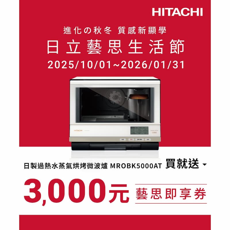本次檔期活動,買日本製過熱水蒸氣烘烤微波爐 MROBK5000AT 或日本製滾筒洗脫烘 BD-SX120HJ/BDSX120HJR,就送3,000元藝思即享券!