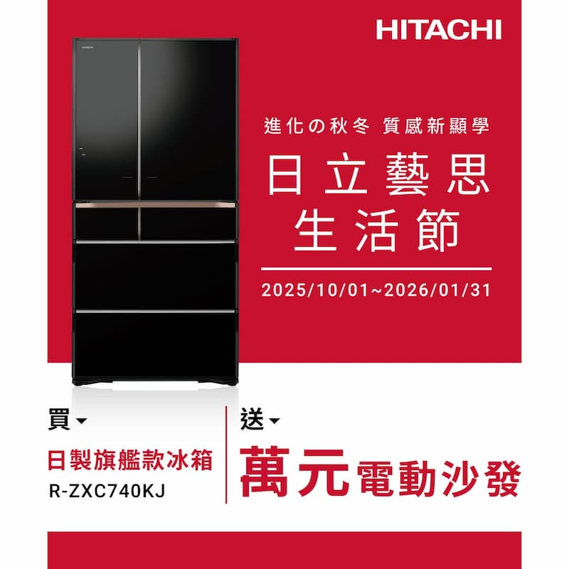 活動期間,購買日本製旗艦款冰箱 RZXC740KJ 就送價值超過萬元電動沙發。RZXC740KJ具741公升超大容量、結合觸控式自動雙開門即鮮保存,透過日立獨家真空保鮮技術,鎖住食材風味與營養,每一口都像剛買回家般新鮮, 此外更有眾多旗艦機種釋出超殺優惠,讓您輕鬆享受「美味藏鮮工藝」帶來的質感生活新顯學。