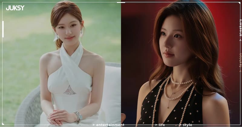 趙露思在《許我耀眼》中也展現了多套華麗禮服造型,例如:金色細肩帶長禮服,服裝的皺褶與收腰設計不僅增添亮點,也優化身形比例,使整體氣質空靈如仙女;或以短袖白色襯衫搭配黑色蓬蓬短裙,不規則衣領與蓬袖剪裁提升時尚感,再配上珍珠項鍊,完美展現出富家千金般的氣場。