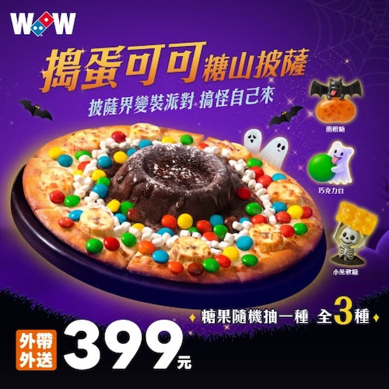 達美樂參戰萬聖節變裝派對!迎接搗蛋月,達美樂結合最應景的趣味變裝與搗蛋討糖元素,讓超人氣「可可火山披薩」華麗變身五彩繽紛的「搗蛋可可糖山披薩」,並召集大小搗蛋鬼盡情搞怪、秀出鬼點子,用經典糖果打造獨一無二的糖山披薩!即日起,最適合好友同享、親子共玩的「搗蛋可可糖山披薩」全台限量販售,單顆只要 399 元,同步推出「搗蛋小套餐」及「萬聖小套餐」等限定組合,就讓達美樂喚醒全家老小的搞怪基因,一起大鬧萬聖節!