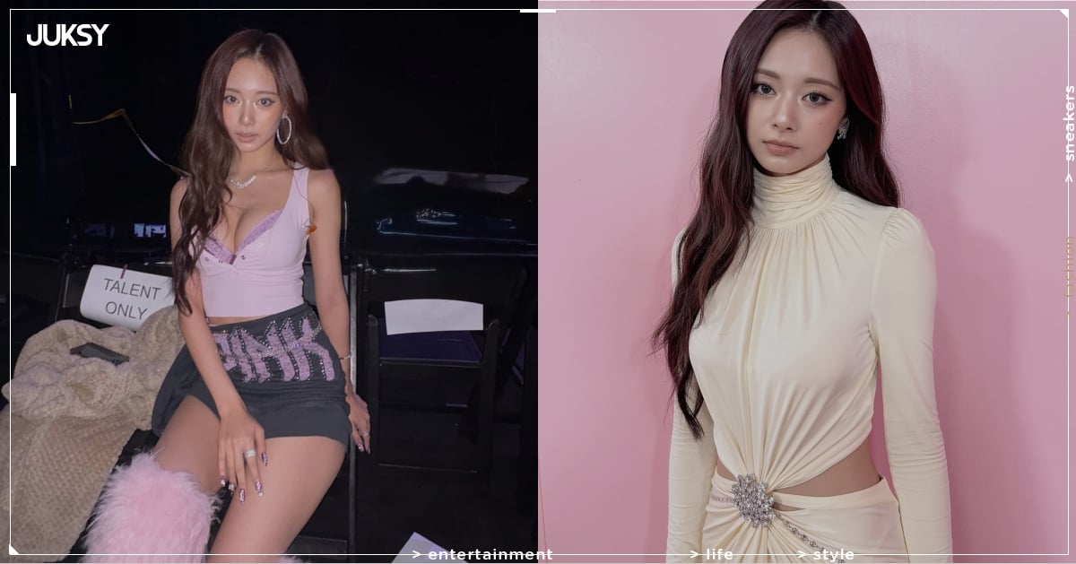 周子瑜近日於個人 IG 分享多張 Victoria’s Secret 時尚秀的幕後照,進一步揭曉當天的造型細節,她身穿品牌的酒紅與粉色拼接蕾絲內衣,外搭淡粉無袖排釦背心,解開全部釦子營造若隱若現的層次感,下身配上印有紫色字樣的深藍貼身短裙與金屬腰鍊點綴,腳踩粉色毛絨過膝長靴,整體造型甜美中帶點性感,她的黑粉鑽面美甲更印上「TWICE」字樣,細節滿滿。照片中,子瑜或坐或站凝視鏡頭,時而比「YA」、比愛心或叉腰,散發自信與魅力,她更上傳一張身披品牌粉色條紋睡袍的美照,以及兩張身著白色禮服走紅毯的照片,腰間鏤空設計完美突顯凹凸有致的身形。這場秀堪稱是她出道以來最大尺度的突破,從清純少女蛻變為散發成熟氣場的時尚女神,以自然優雅的姿態詮釋性感卻不失高雅的時尚魅力,讓各國媒體爭相報導。