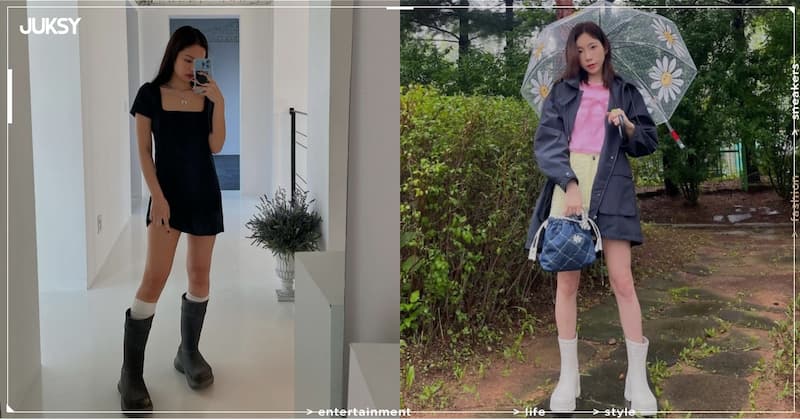 想要在雨鞋穿搭這門學問上更進階?那你絕對要收藏 BLACKPINK Jennie 同款造型!無論是像 Jennie 一樣以短洋裝搭配,或選穿短褲、短裙展現俏皮感,都能嘗試在雨鞋內搭配高筒長襪,刻意露出一小截襪身,讓整體造型更有層次。若選擇與雨鞋撞色的襪款,能瞬間增添亮點與時髦感;若改搭同色系襪款,則能延伸腿部線條,讓比例更顯修長,視覺上更加纖細高挑。這樣的穿法不僅實用又吸睛,可說是現今最流行、也最能展現時尚態度的雨鞋穿搭技巧!