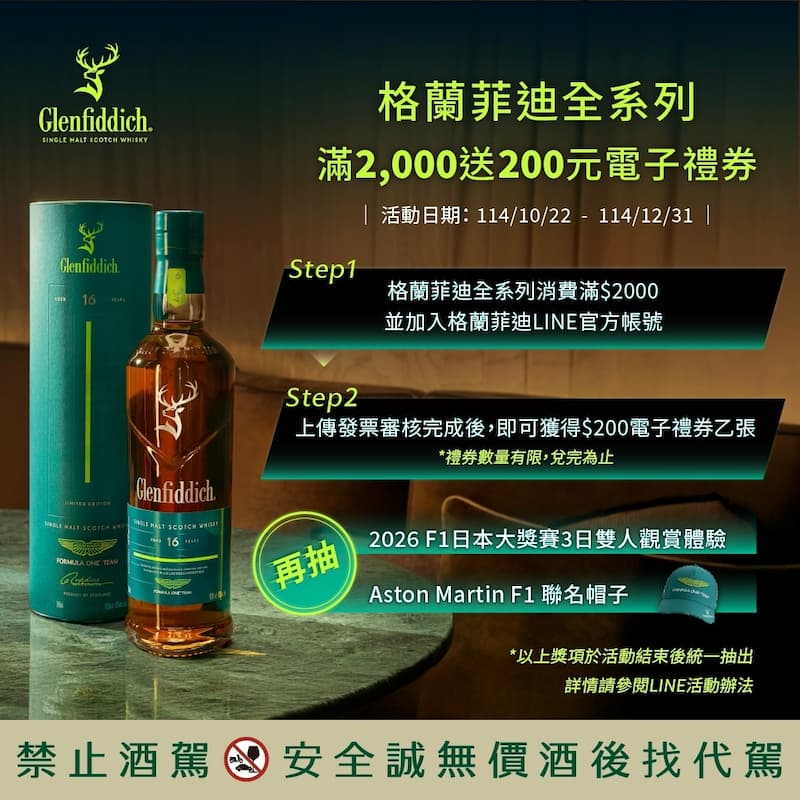 格蘭菲迪更將熱潮擴展至全台指定合作通路,10/22 至 12/31 綁定官方 LINE 帳號並購買格蘭菲迪全系列商品滿 NT$2,000,即可獲得 NT$200 電子禮券(數量有限,兌完為止);完成發票登錄者,更有機會抽中「Aston Martin F1 聯名帽子」,以及終極大獎「2026 F1 日本大獎賽 3 日雙人觀賞體驗」。格蘭菲迪邀請全台消費者一同沉浸於速度與品味交織的盛宴,讓每一次舉杯,都是邁向非凡旅程的起點。