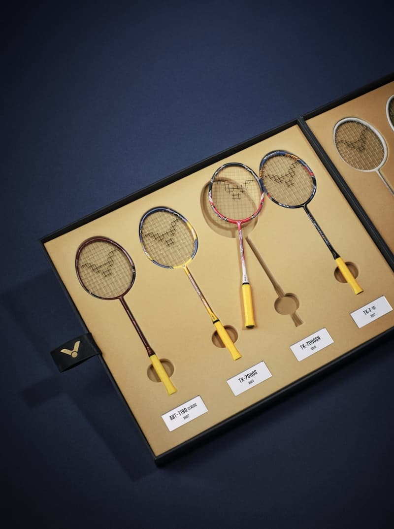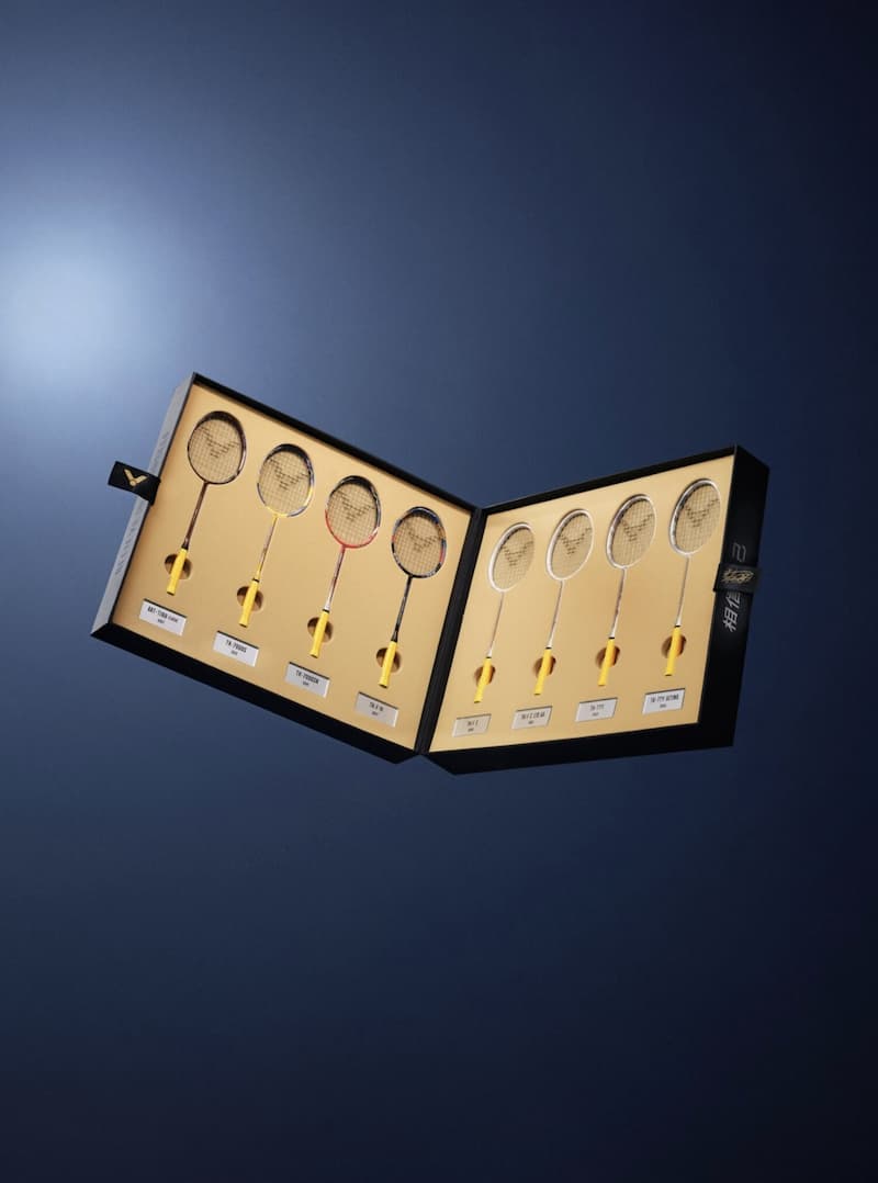 戴資穎以靈巧的身手、獨特的控球節奏與創造性的打法席捲羽壇,她締造歷史最長 214 週世界球后在位紀錄,奪下 32 座世界巡迴賽冠軍,奠定她在羽壇無可取代的地位。為紀念及致敬小戴球后生涯,VICTOR 推出「戴資穎歷代戰拍迷你收藏組」,將戴資穎生涯經典八款球拍精緻還原,包含戴資穎獨特的穿線法及慣用的黃色握把布皆完美復刻,全球限量共 2140 組。