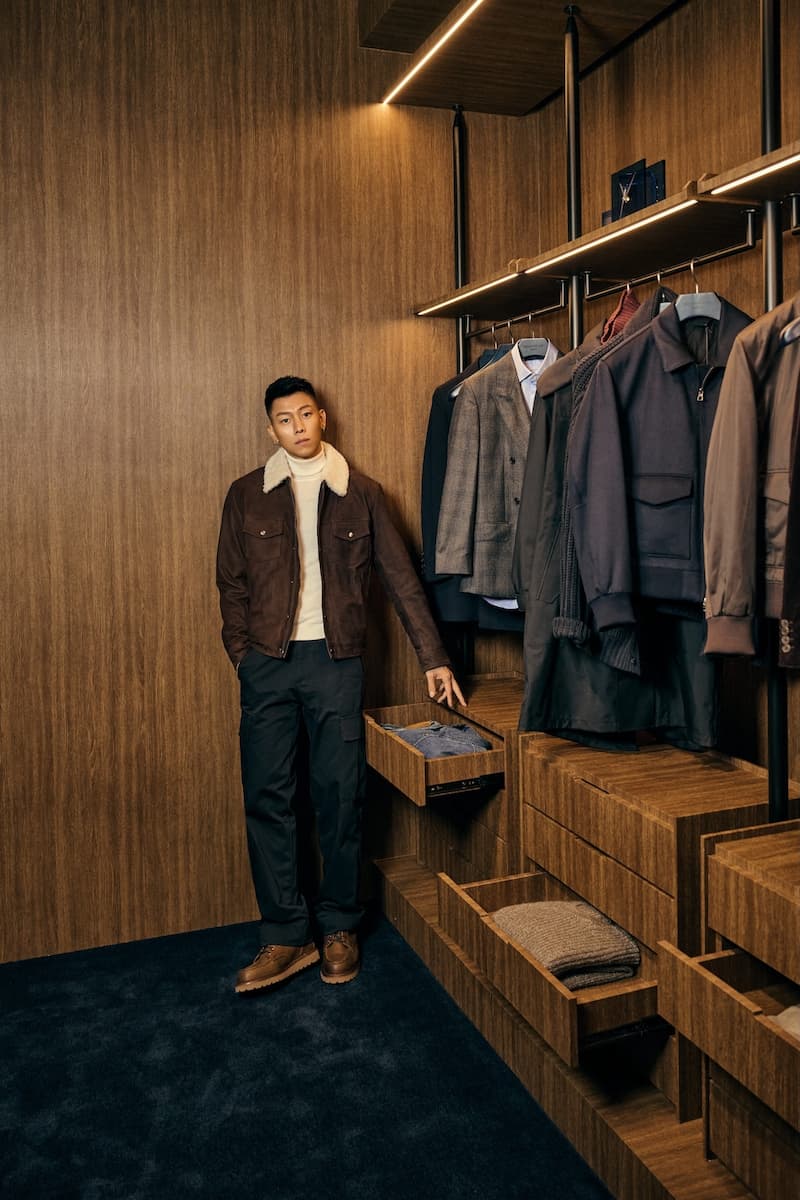 在這座以英倫紳士會所為靈感所打造的空間中,E.SO 走過一幕幕象徵貝克漢式風格日常的場景:從重現英倫裁縫店氛圍展示系列核心造型的紳士衣櫥,到可以近距離欣賞設計手稿與布料細節的設計工坊、再到藏於空間深處如頂級私人會所的英式酒吧,與位在酒吧一角別具風味的復古電話亭,當 E.SO 拿起話筒的瞬間,仿佛與貝克漢進行一場關於紳士風格的對話。