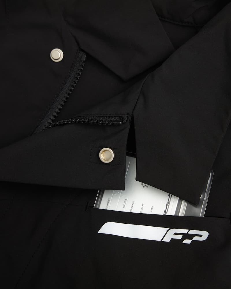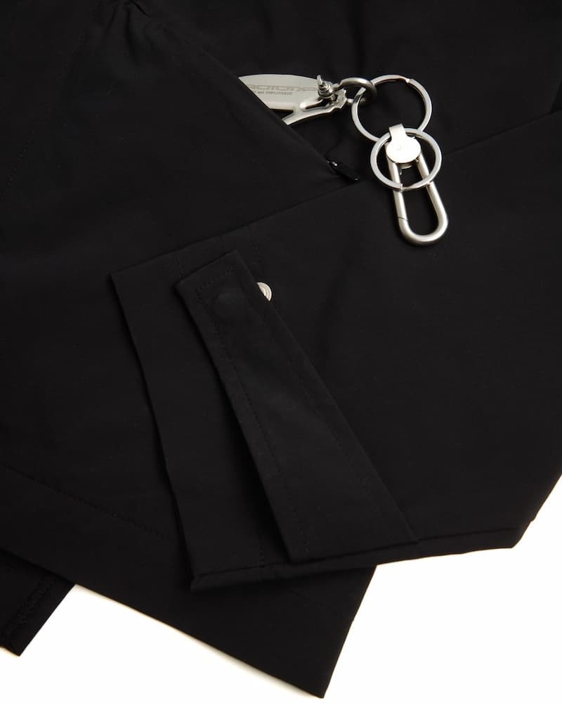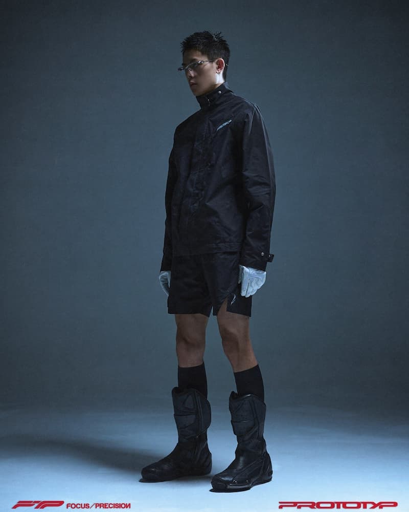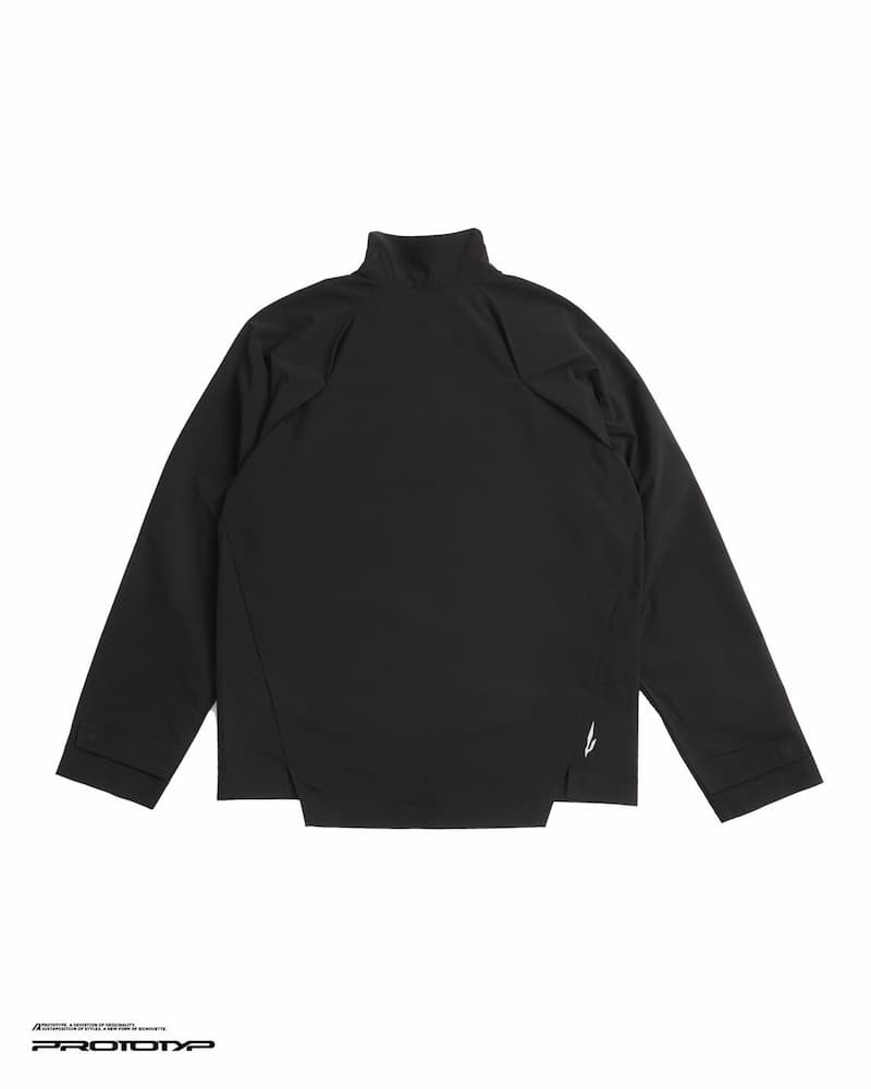 這款 PROTOTYP 高機能立領外套 以極簡黑為基調,融合城市機能與俐落剪裁。主體採用防風、防潑水的聚酯纖維面料,並加入尼龍與彈性纖維混紡,兼具輕盈與延展性。配置 YKK QuickFree® 快拆拉鍊、隱藏式拉鍊口袋與透氣網布內裡,細節實用而低調。背部摺褶與下擺開衩設計讓活動更靈活,前後反光 Logo 則強化夜間辨識度。中性版型可男女共穿,無論通勤或雨天移動都能兼顧防護與造型。
