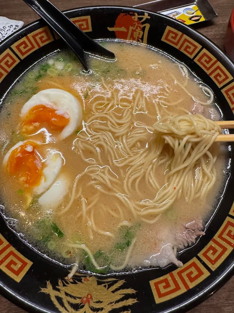 九州就是一蘭拉面的發源地,而全日本最大的一蘭總店就坐落在福岡!人氣超旺,招牌豚骨拉麵必點,湯頭十分鮮美,大片叉燒肥瘦相間,油香混合肉香超迷人,而半熟溏心蛋更是點睛之筆,蛋液微微流動,和湯底、麵條拌在一起,口感層次滿分;抹茶杏仁豆腐也是每次必點的甜點,吃完心情直接爆好。店內還有特色的一人食小隔間,讓人可以完全沉浸在吃麵的快感裡。人氣套餐包含一碗麵、單包海苔、叉燒、黑木耳和半熟蛋,再加上抹茶杏仁豆腐,總共約 400 元出頭,CP 值超高。總之,一蘭拉面總店絕對值得打卡!每天 20:00-20:15 在陽台會有日本傳統樂器表演很精彩~