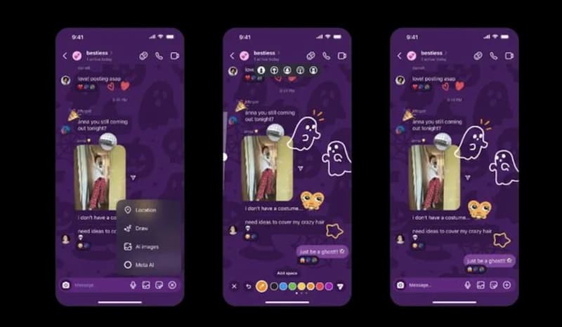 塗鴉功能的使用方式相當簡單,只要進入 IG 聊天室,點擊右下角「+」按鈕,選擇「塗鴉」選項,畫面上方就會出現四種不同畫筆與一個橡皮擦工具,下方還能挑選各種顏色。設定完成後就能直接在聊天室中盡情塗鴉創作,畫完後記得按右下角「送出」鈕分享給好友。這項功能讓聊天室瞬間變身創意畫布,用戶能和好友即時揮灑想像力、畫出搞笑迷因或添加節慶元素,像是在對話中畫上骷髏頭、南瓜臉,就能創造萬聖節專屬的互動樂趣。另一項新功能則是讓用戶可以用貼圖或 GIF 動圖直接回覆特定訊息,表情符號會直接「黏」在聊天框上,讓回應更生動有趣。
