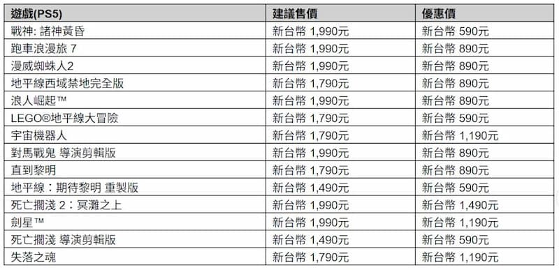 活動期間,PlayStation 推出多項超值折扣:PS5 主機系列(包含 PS5 主機、PS5 數位版主機與 PS5 Pro 主機)可享新台幣 3,200 元優惠;PlayStation Portal 提供新台幣 600 元折扣;DualSense 無線控制器折抵新台幣 300 元;PULSE Explore 無線耳塞式耳機則祭出高達新台幣 900 元的限時優惠。此外,眾多人氣 PS5 遊戲如《DEATH STRANDING 2: ON THE BEACH》、《宇宙機器人》、《Marvel’s Spider-Man 2》與《劍星》也同步推出折扣價,讓玩家能以更實惠的價格擴充遊戲收藏。
