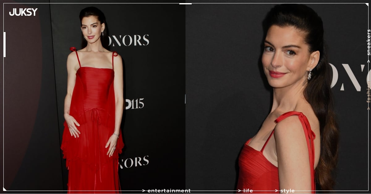 WWD 2025 Honors 於紐約 Cipriani South Street 盛大登場,安海瑟薇以義大利精品 Valentino 的紅色晚禮服現身,展現極致的高雅魅力,裙裝上身以細膩的抓皺剪裁突顯身形曲線,下擺延伸出層疊裙襬,流動感十足,胸前蝴蝶結裝飾巧妙劃分比例,增添浪漫氛圍,細肩帶以同款蝴蝶結結構固定,並垂下長流蘇,隨步伐輕盈擺動,讓她每一次轉身都光彩奪目。她選以淡玫瑰色妝容襯托紅裙氣勢,配上鑽石耳環、手鍊與戒指,綻放高貴光芒,髮型採半紮半放設計,清新自然又不失柔美,整體造型完美詮釋「紅毯女王」的風采。