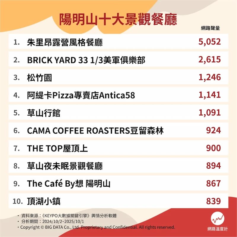 陽明山,就像是一座離城市最近的秘境。當生活被忙碌壓得喘不過氣,不妨上山走走,讓大自然替你充電。春天滿山花海盛放,美得像一幅動人畫卷;夏日綠意清涼,宛如置身世外桃源;秋冬雲霧繚繞,山嵐環抱,寧靜而神秘。無論哪個季節,都有理由讓你愛上這片山林,想一去再去。走在綠意盎然的小徑間,一邊品嚐美食,一邊在玻璃屋裡沐浴陽光,或遠眺森林與自然相融的景致,都是人生難得的享受。《網路溫度計DailyView》透過輿情分析軟體《KEYPO大數據關鍵引擎》,排除僅提供小食、飲品的店家,整理出十家人氣景觀餐廳,風格多元,有日式的溫馨雅致、歐風的浪漫氛圍,還有美式的休閒度假風,十月連假就是出遊的最佳時機。快揪上親朋好友,一起品味佳餚、欣賞迷人景致,讓身心在花海與山嵐間徹底放鬆。